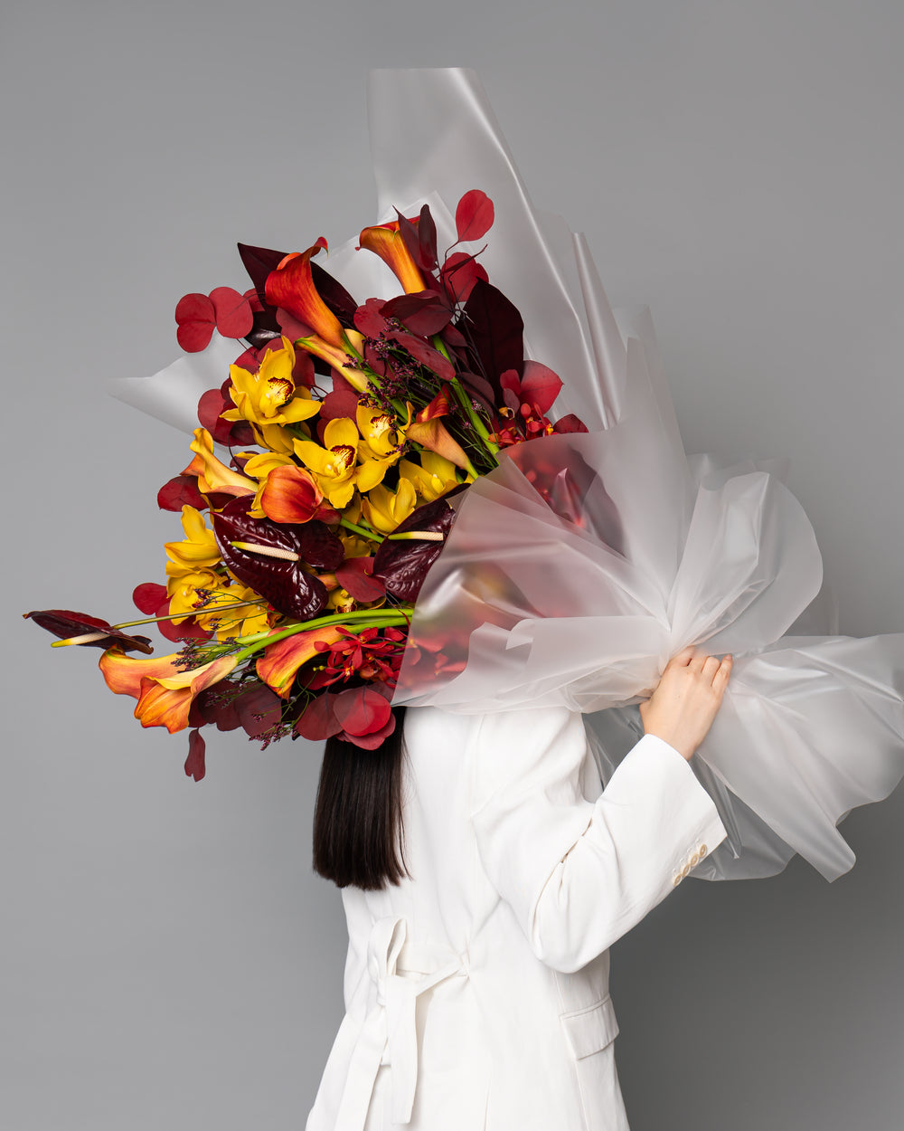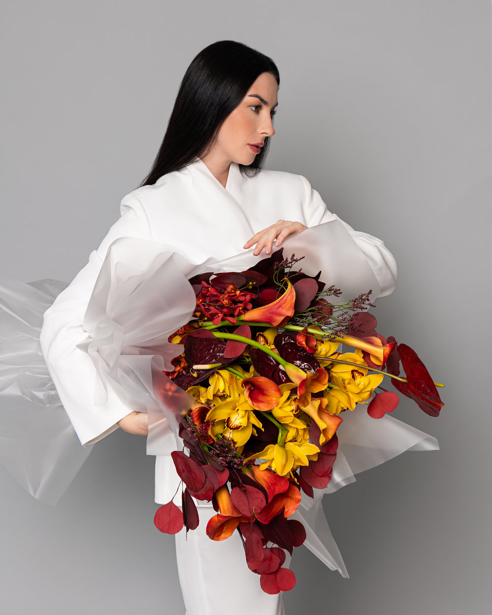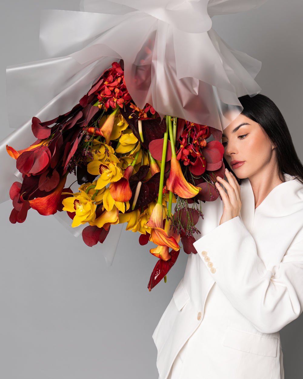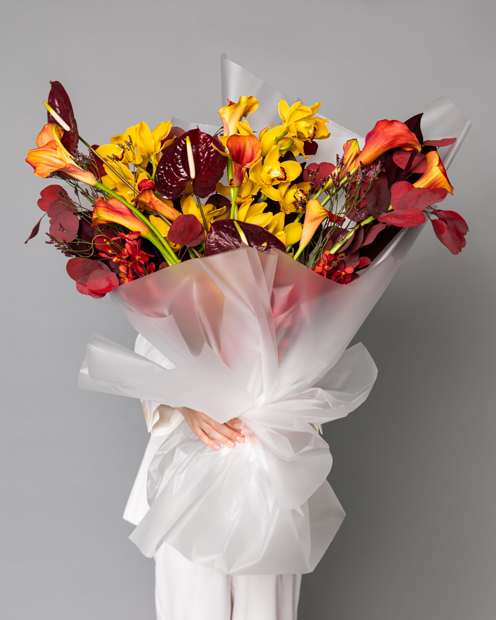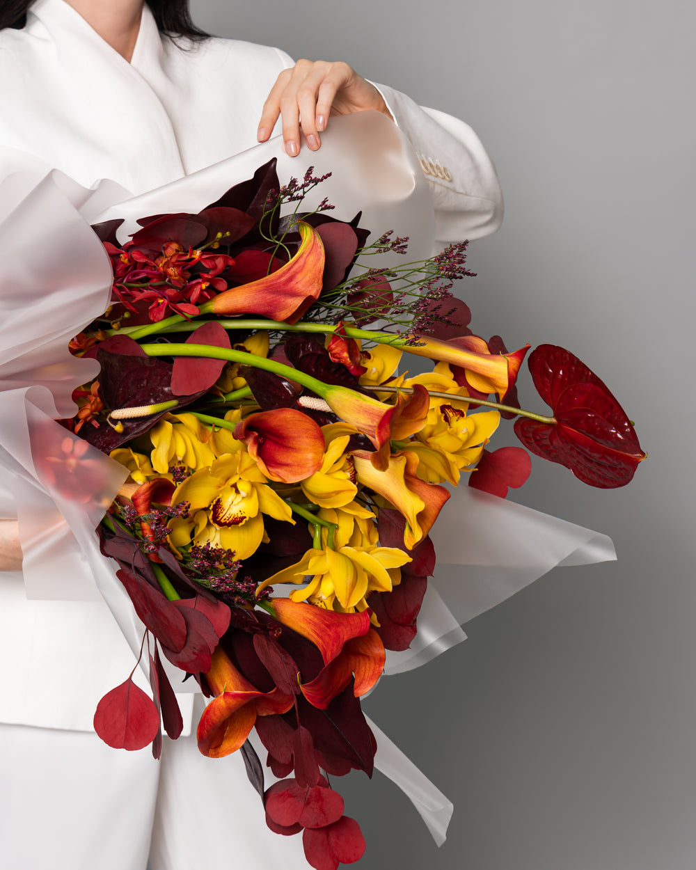 A radiant bouquet blending fiery orange calla lilies, deep red anthuriums, and vibrant yellow orchids. Bold yet elegant, this striking arrangement captures the warmth of a sunset, perfect for celebrating life’s most luxurious moments.