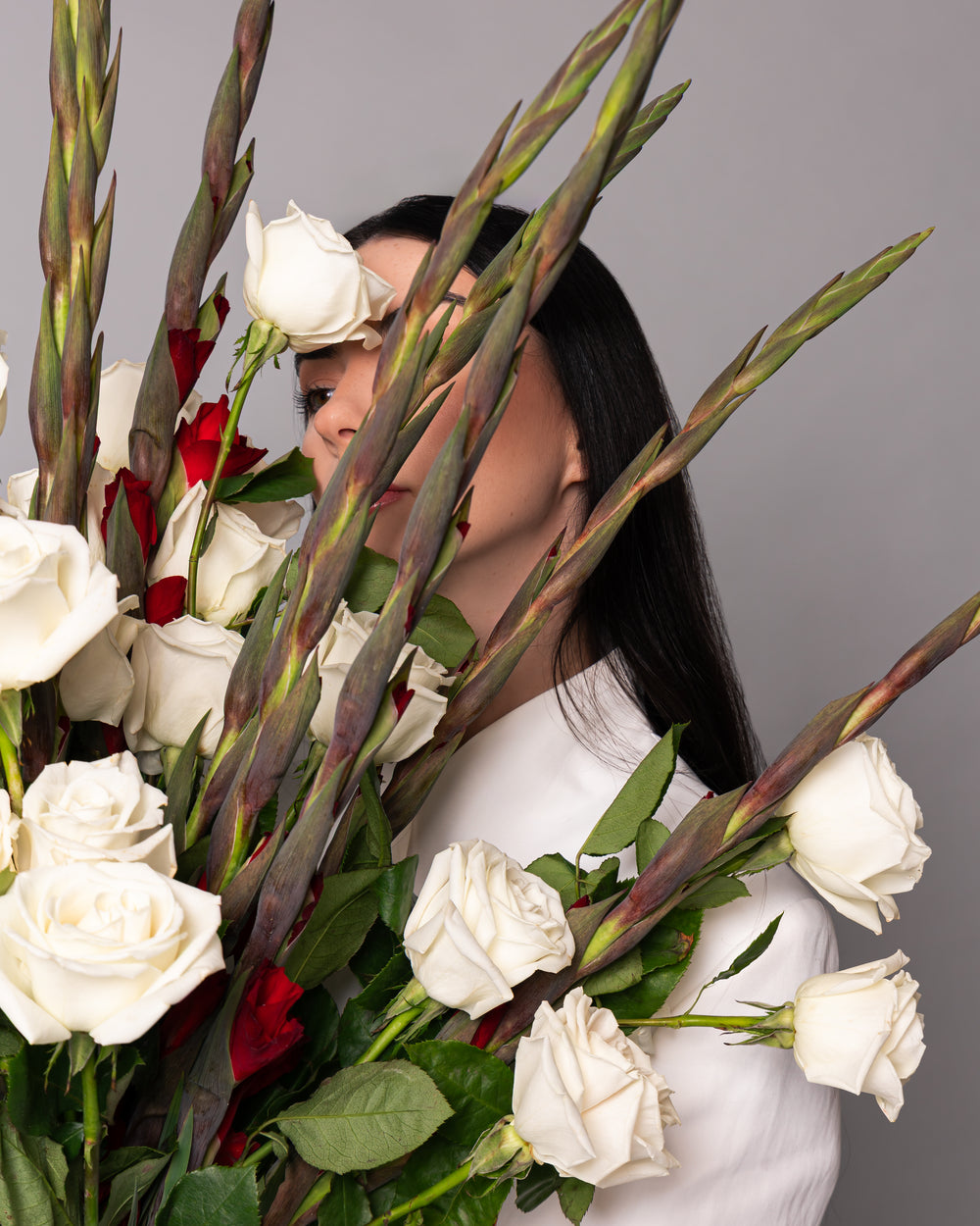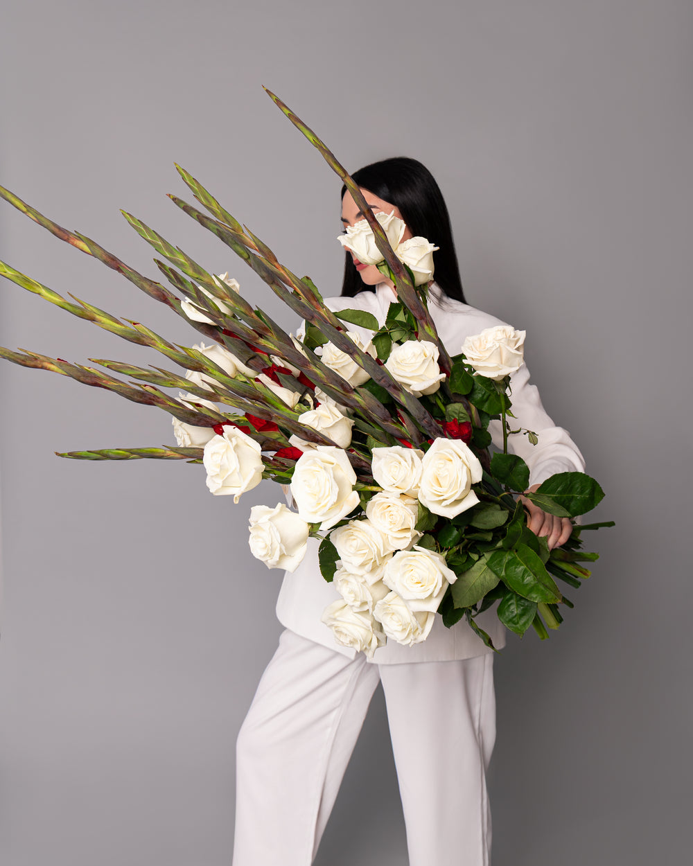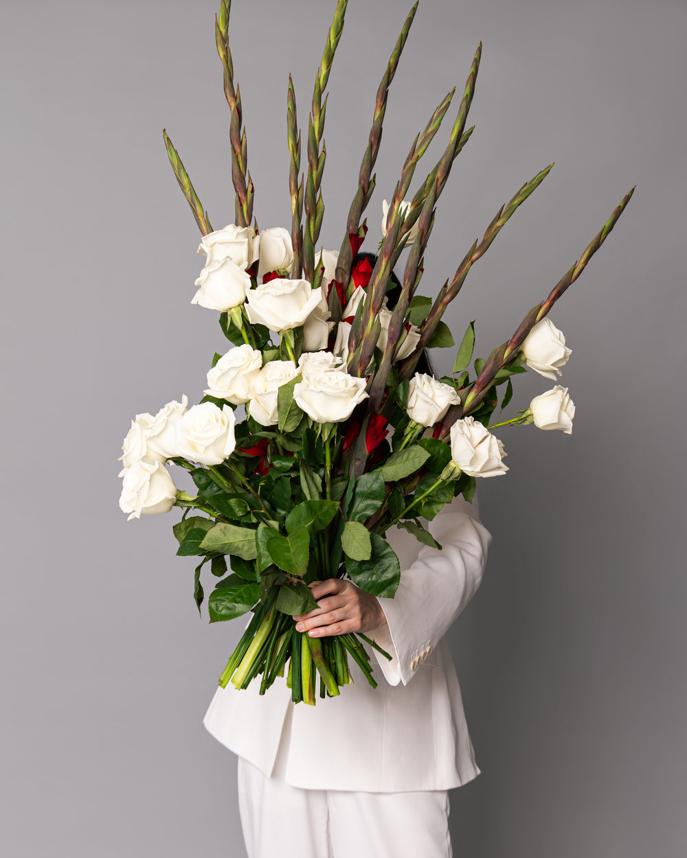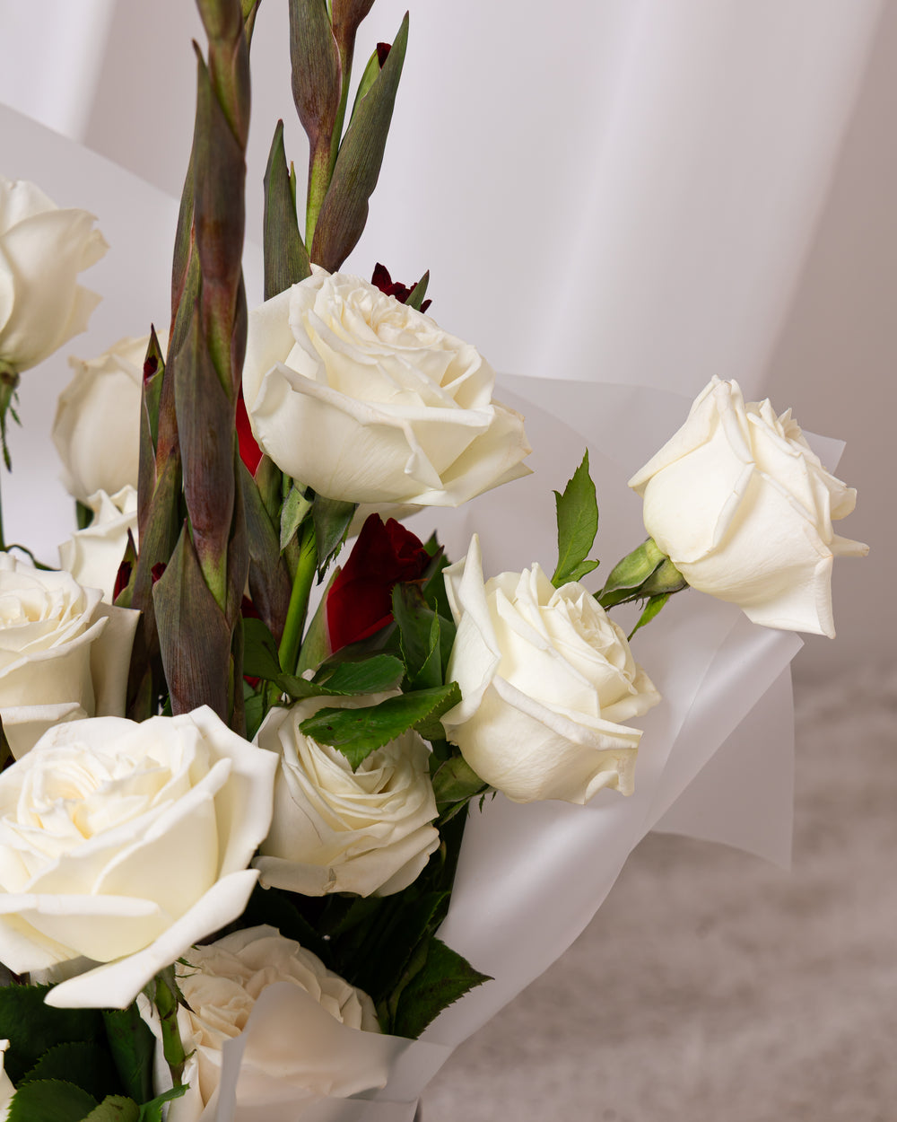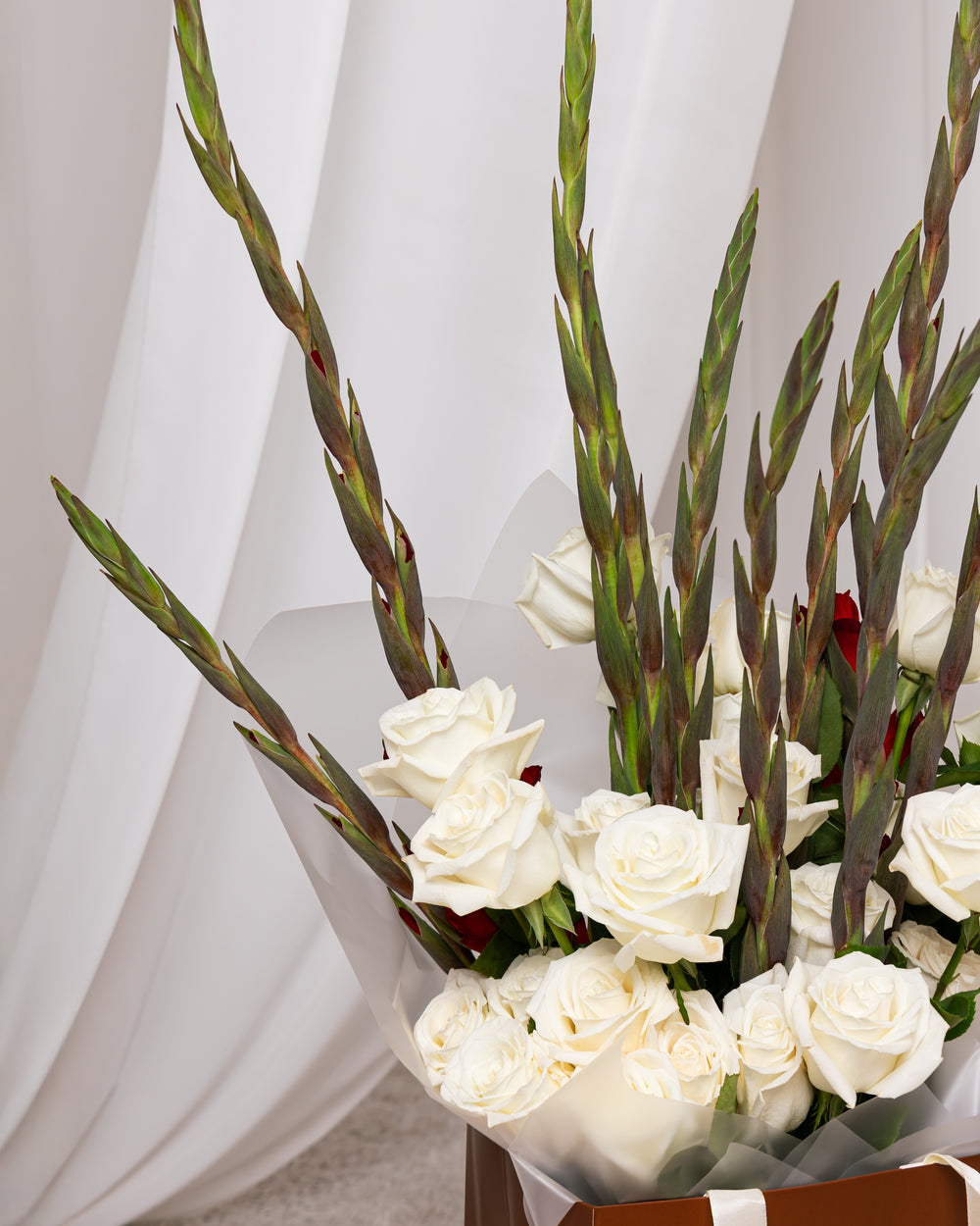 A composition of pristine white roses entwined with deep red accents and towering gladiolus stems. Bold, refined, and irresistibly captivating, this arrangement embodies the perfect balance of elegance and passion.