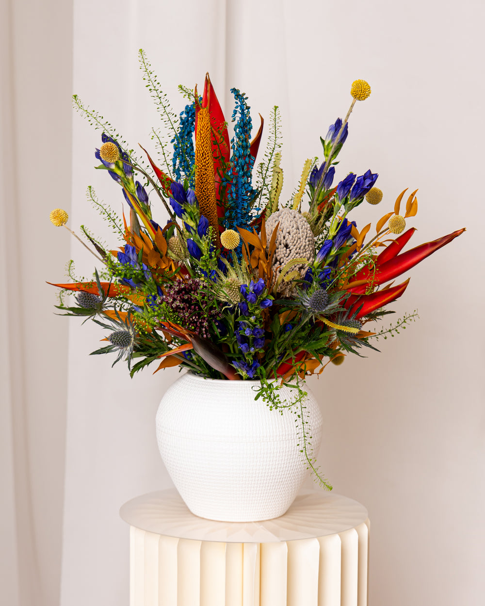 A maximalist masterpiece of untamed beauty, Jungle Fever is a spectacular curation of rare, exotic treasures. This vibrant arrangement is an explosion of intense, saturated color and dramatic texture, featuring fiery heliconia, electric blue spikes, and the impressive, sculptural form of the Banksia bloom. Presented in a chic white vessel, this piece is an exuberant, luxurious symphony, celebrating the opulent, wild heart of the tropics.