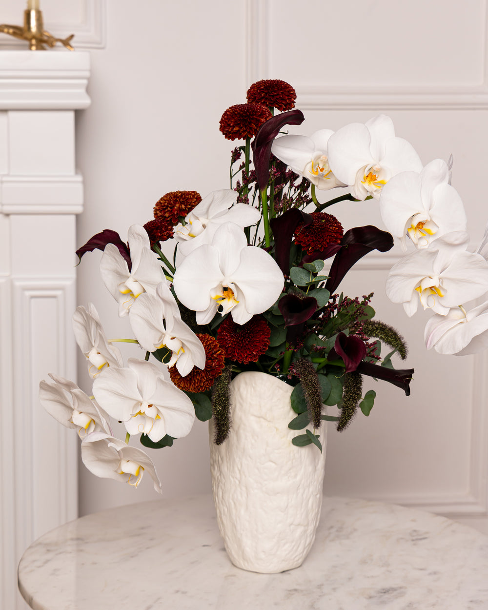 A masterpiece of modern elegance. Majestic Phalaenopsis orchids in pristine white emerge gracefully against a sumptuous backdrop of velvet burgundy calla lilies and deep crimson blooms. This couture-inspired palette radiant white contrasted with the richness of midnight tones—creates a breathtakingly arrangement. Bold, refined, and unapologetically luxurious, it is the ultimate expression of sophistication and style.