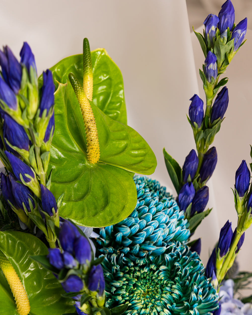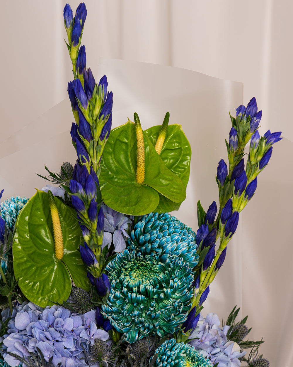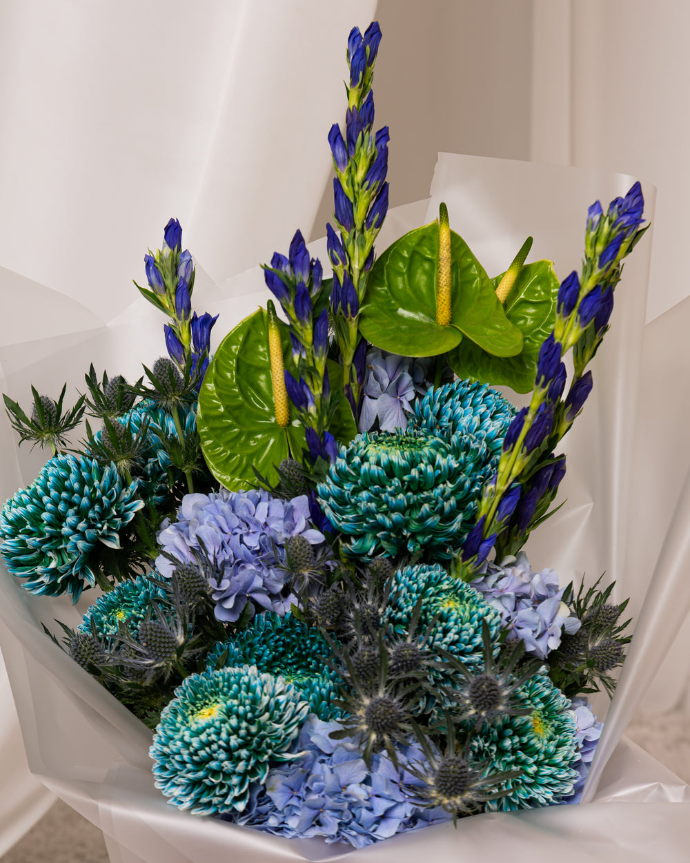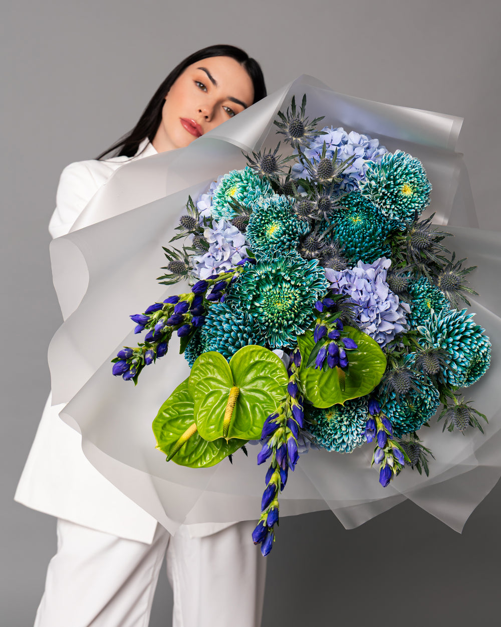Inspired by the serene yet intense colors of the sea, this bouquet is a truly mesmerizing piece. It features a spectacular gradient of cool tones, blending vibrant teal chrysanthemums and soft periwinkle hydrangeas with striking accents of lime green anthurium. Spikes of deep indigo monkshood and silvery-blue sea holly (Eryngium) provide a beautiful contrast in texture and form. This bouquet evokes the tranquility of the deep ocean, making it an exquisitely chic choice.