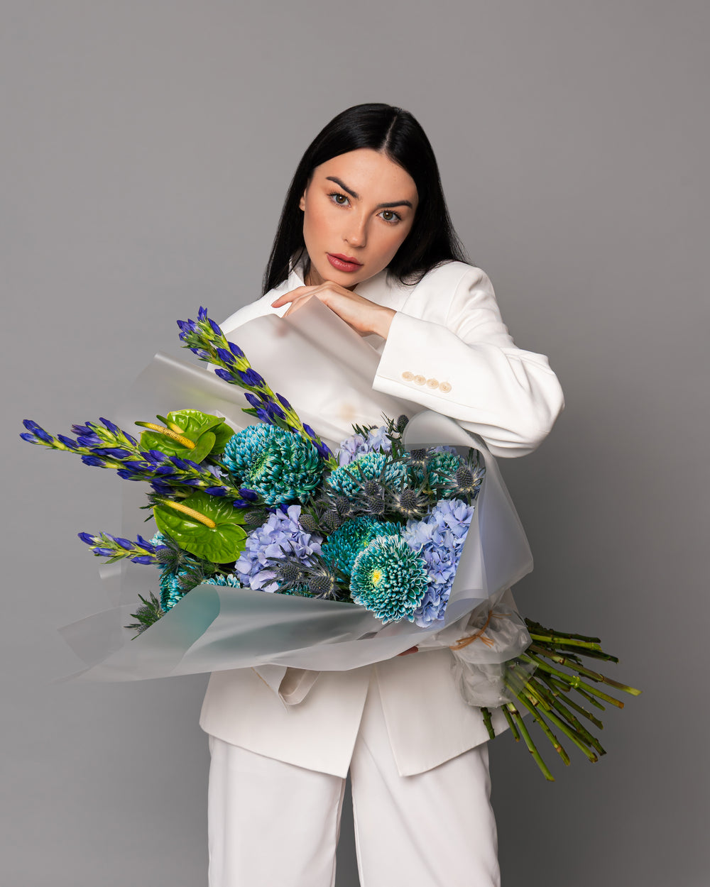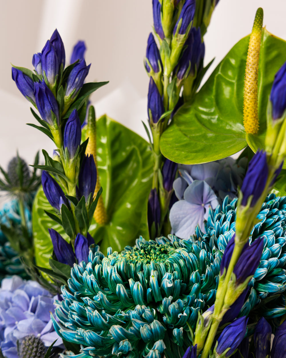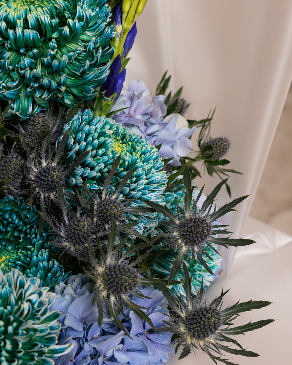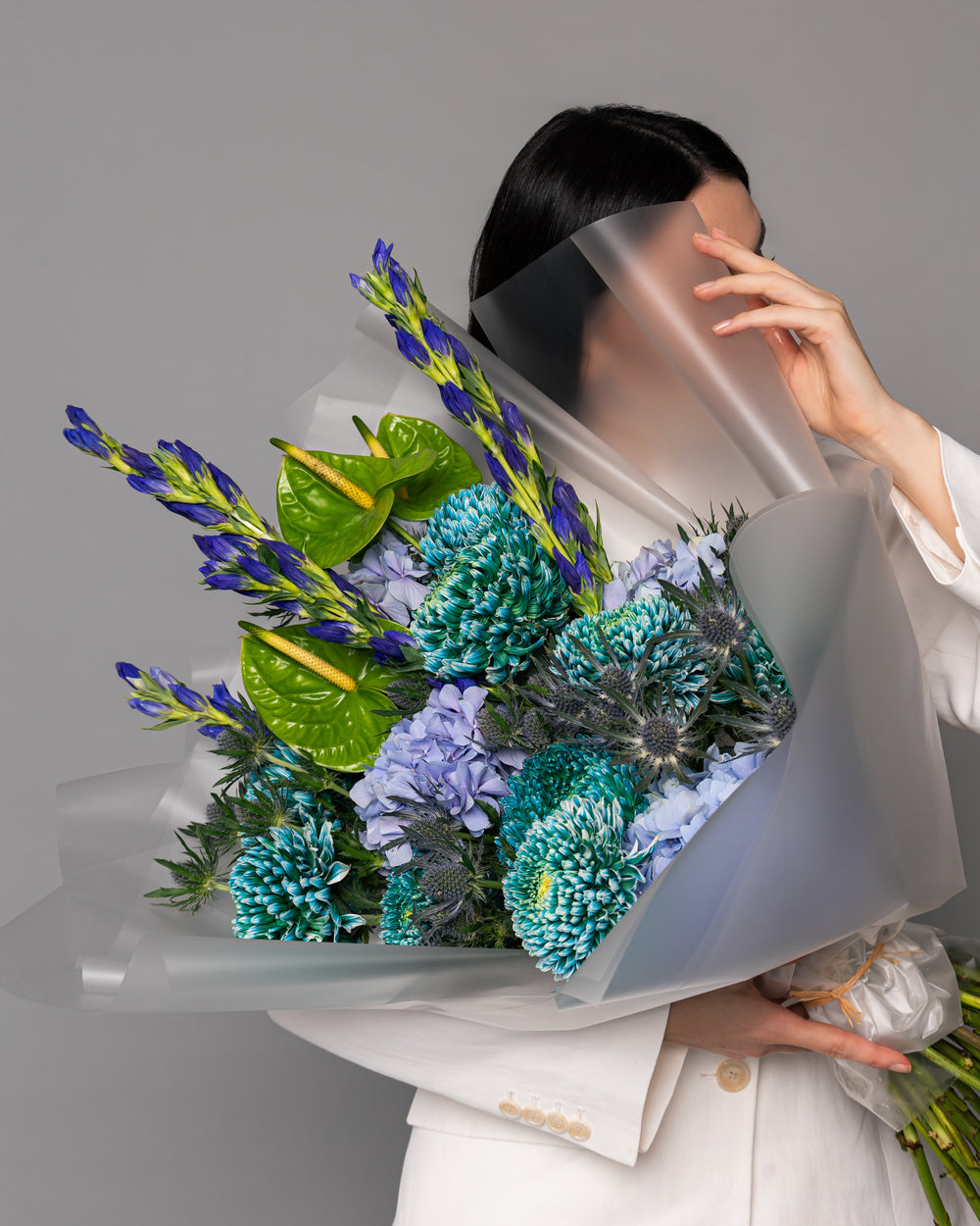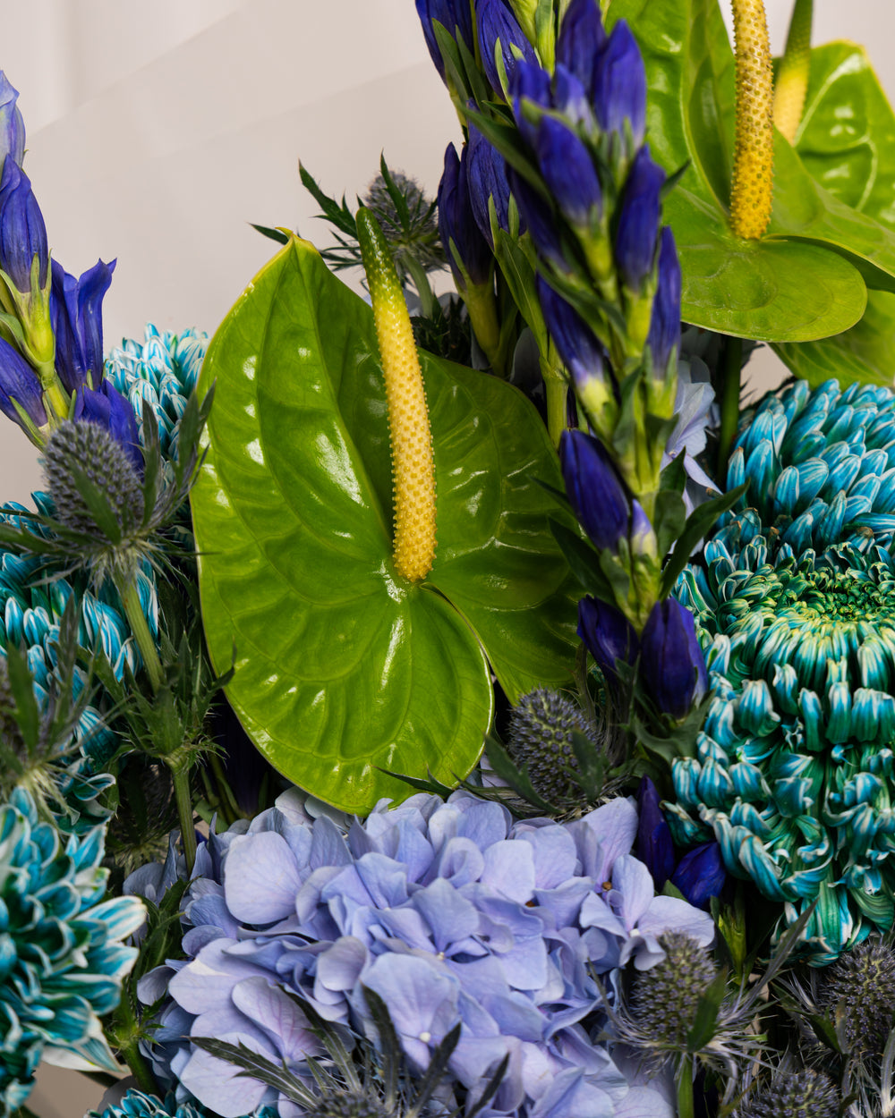 Inspired by the serene yet intense colors of the sea, this bouquet is a truly mesmerizing piece. It features a spectacular gradient of cool tones, blending vibrant teal chrysanthemums and soft periwinkle hydrangeas with striking accents of lime green anthurium. Spikes of deep indigo monkshood and silvery-blue sea holly (Eryngium) provide a beautiful contrast in texture and form. This bouquet evokes the tranquility of the deep ocean, making it an exquisitely chic choice.