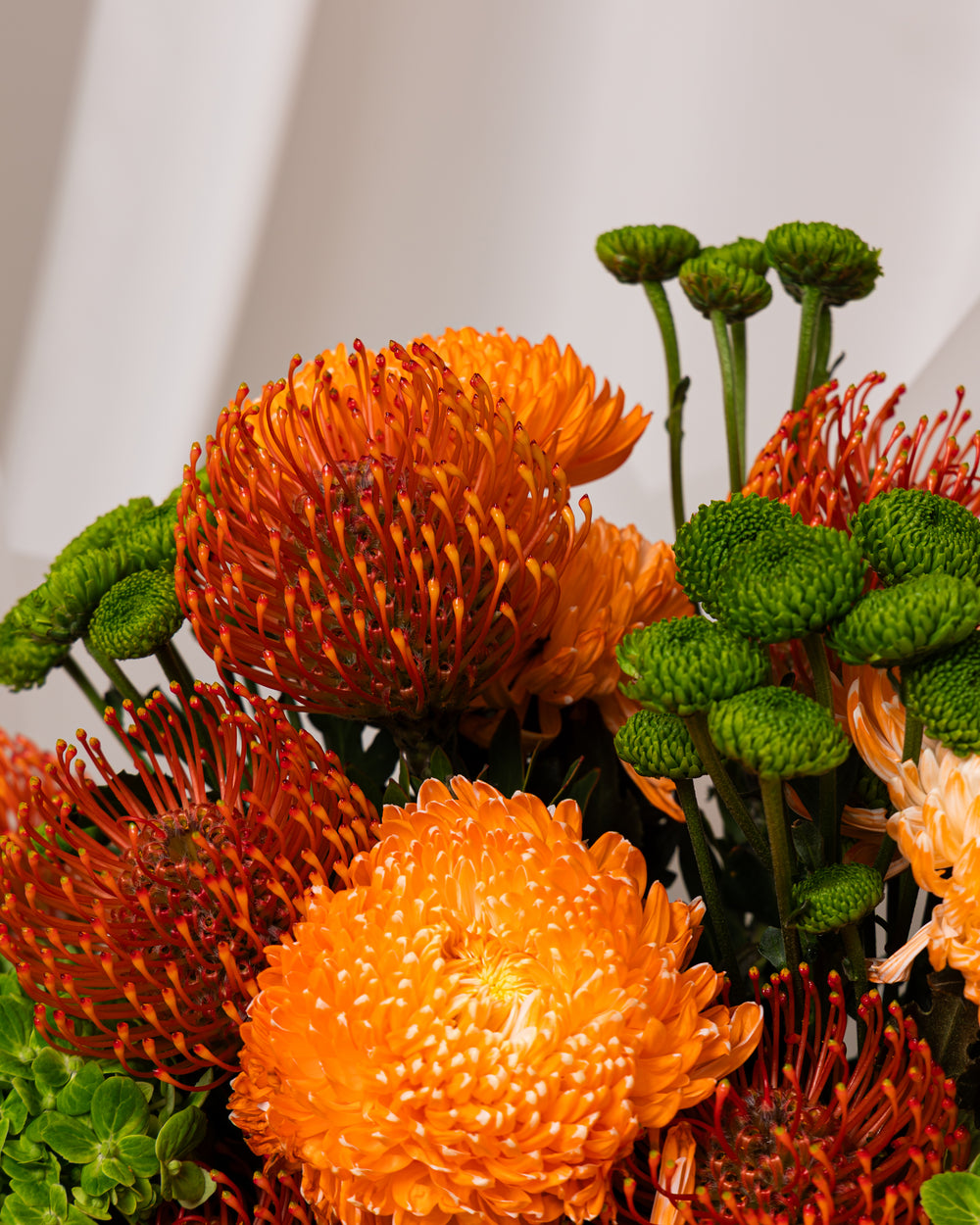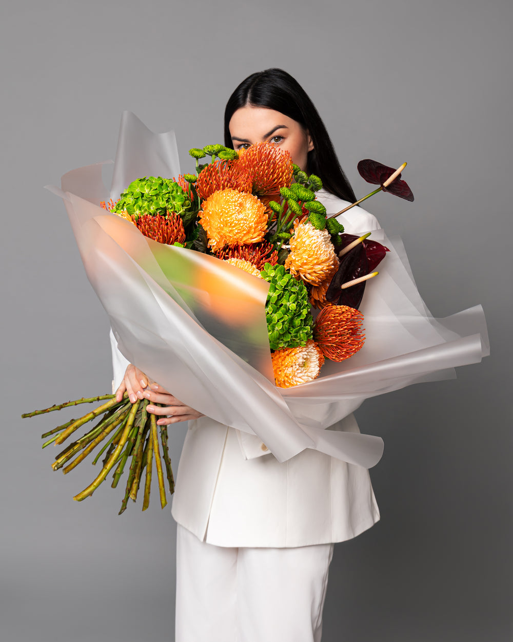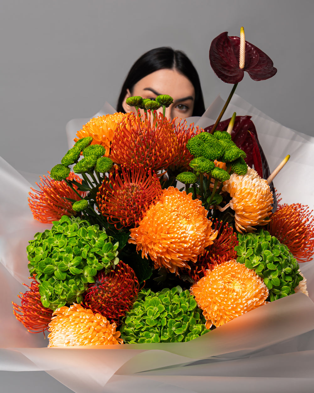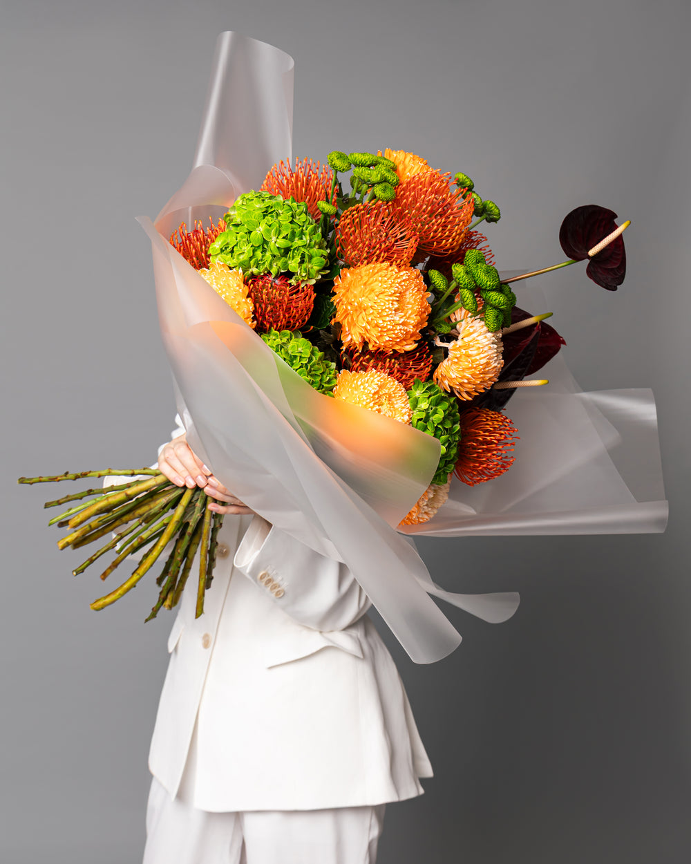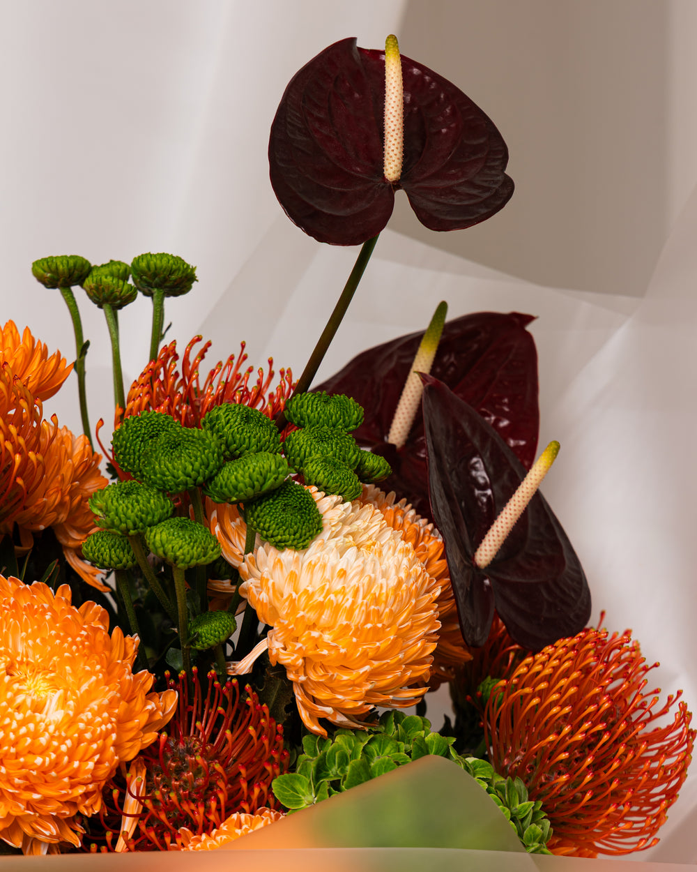 A striking and utterly unique composition, which captures the primal beauty of earth and fire. This sophisticated arrangement features highly textural, globe-shaped blooms in an exhilarating palette of vibrant tangerine, fiery orange, and lime green. Deep burgundy anthurium accents provide a sultry, elegant contrast. Expertly hand-tied and enveloped in sheer, frosted wrapping, this bouquet is a bold, modern statement for the discerning eye.